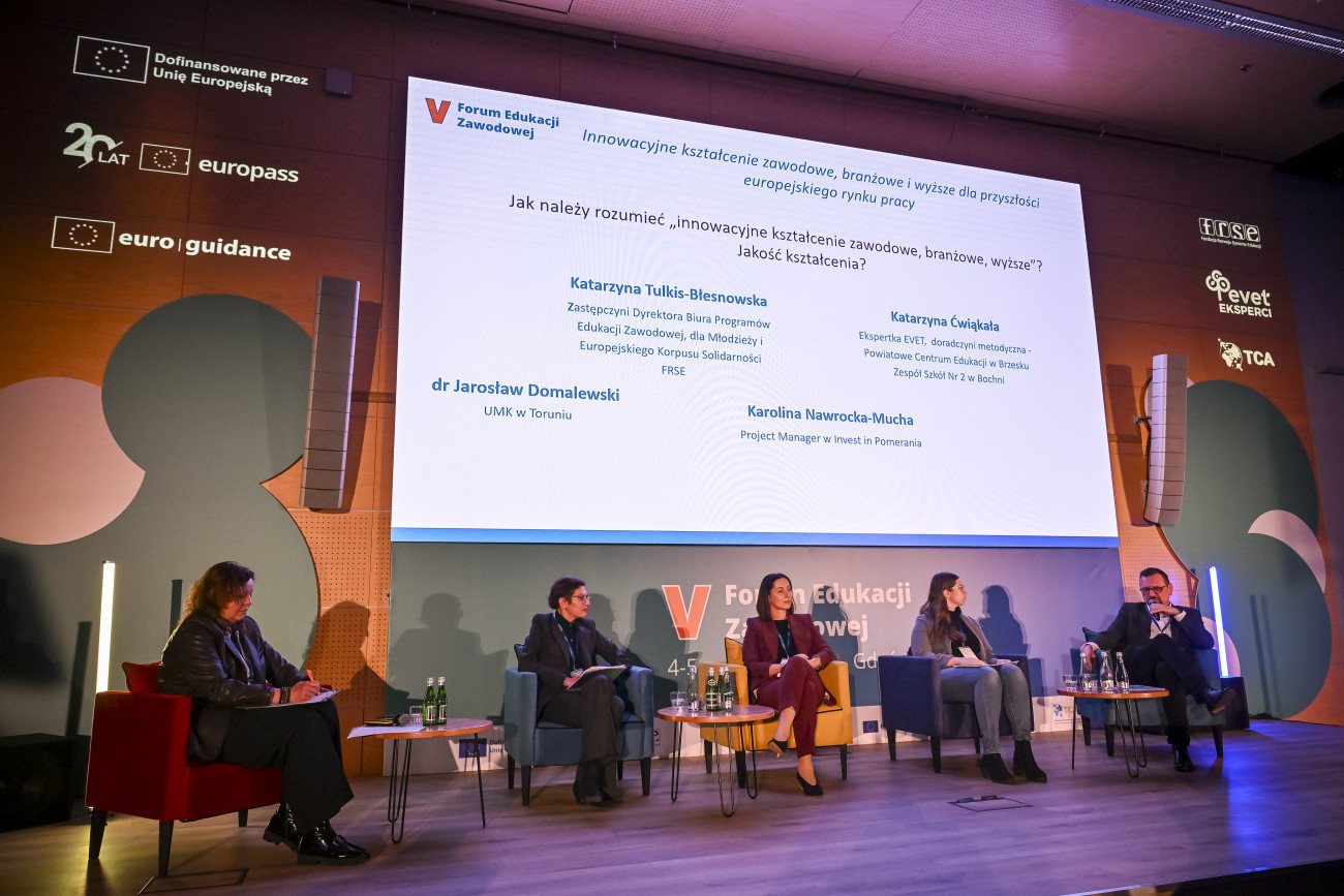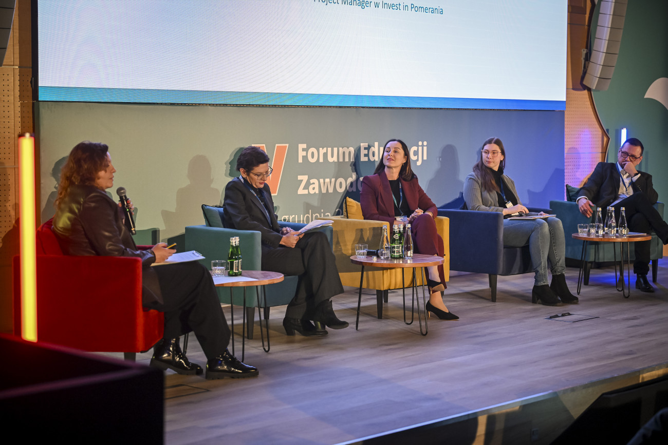 W dyskusji wzięli udział przedstawiciele środowiska akademickiego oraz biznesu, co pozwoliło spojrzeć na wyzwania edukacyjne z wielu komplementarnych perspektyw. Wśród panelistów znaleźli się: Pani Katarzyna Tulkis-Błesnowska, Zastępczyni Dyrektora Biura Programów Edukacji Zawodowej, dla Młodzieży oraz Europejskiego Korpusu Solidarności w FRSE, Pani Katarzyna Ćwiąkała, Ekspertka EVET, doradczyni metodyczna - Powiatowe Centrum Edukacji w Brzesku Zespół Szkół Nr 2 w Bochni, Pani Karolina Nawrocka-Mucha Przedstawicielka z Invest in Pomerania oraz Pan dr Jarosław Domalewski z Uniwersytetu Mikołaja Kopernika w Toruniu.