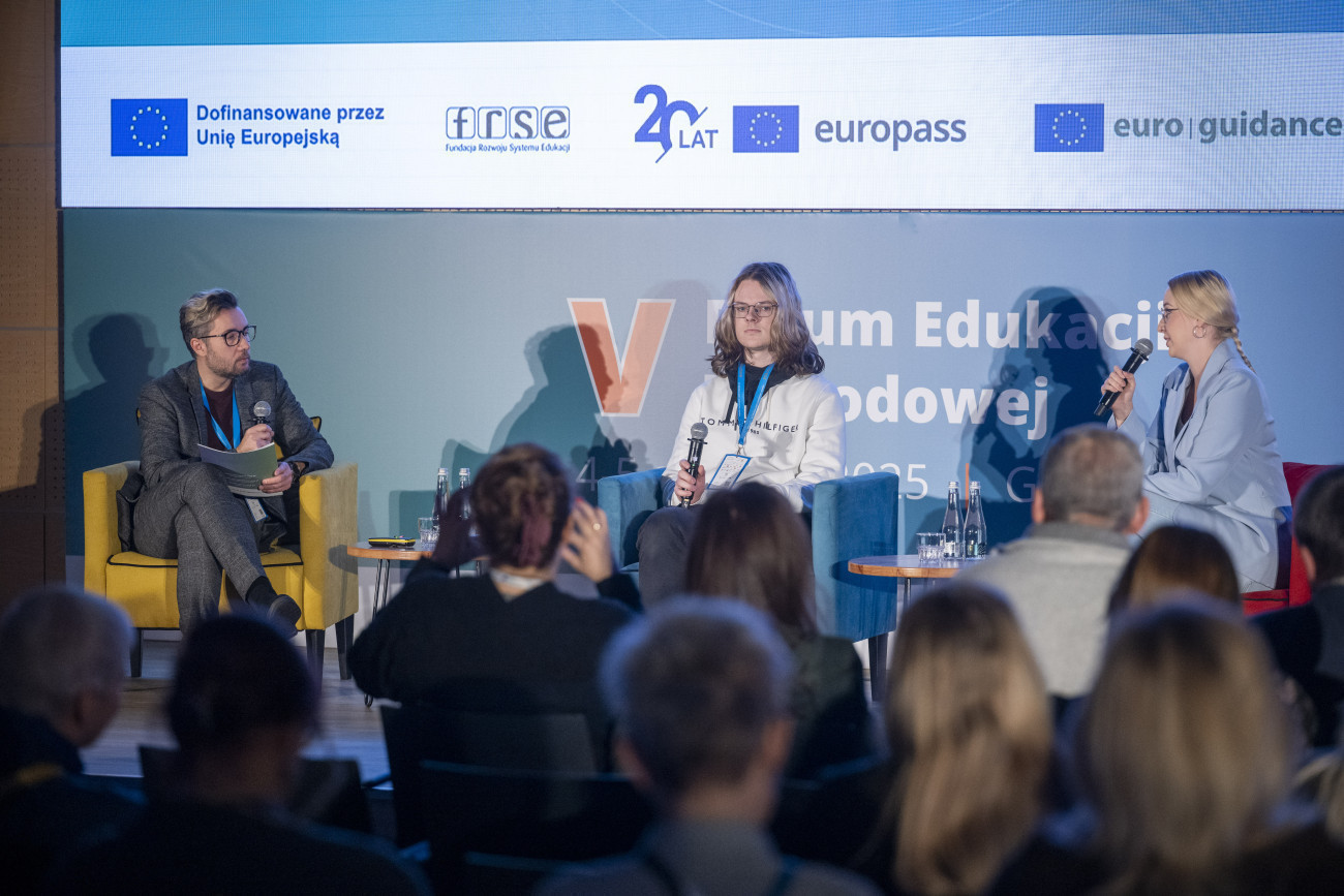 Ważnym uzupełnieniem perspektywy instytucjonalnej były doświadczenia eurostażystów – Darii Szczepankiewicz i Kamila Orzechowskiego, którzy podzielili się osobistymi historiami udziału w zagranicznych stażach. Ich wypowiedzi pokazały, jak mobilność edukacyjna przekłada się na rozwój kompetencji zawodowych, większą pewność siebie oraz świadome planowanie dalszej ścieżki kariery. Przykłady te unaoczniły, że staże zagraniczne są nie tylko elementem edukacji, lecz także realnym impulsem do wejścia na rynek pracy i budowania przewagi konkurencyjnej.